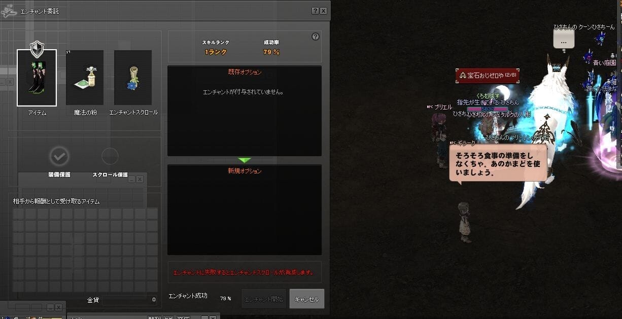 ほたさん(山本ほたて_mar)がPTに入るや、無言ですぐさまエンチャント委託ウィンドウを開きました。