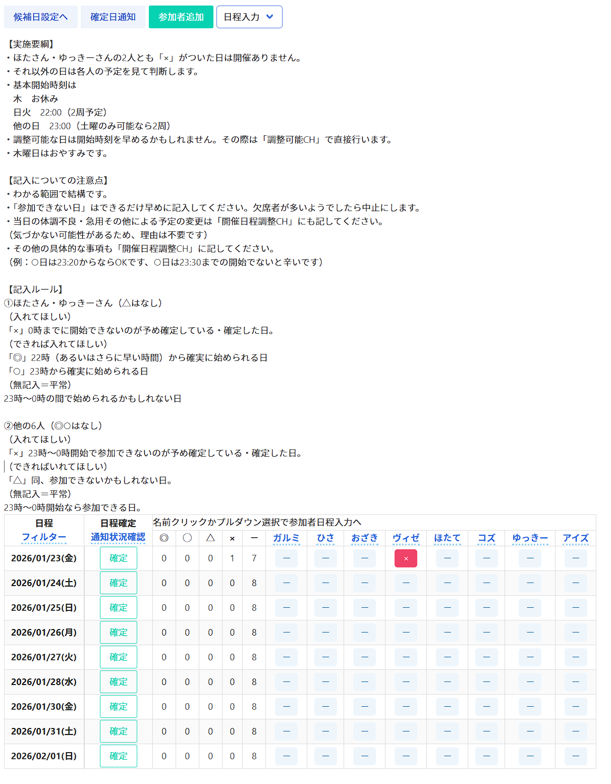 今はデイコードでみんなが参加可能日を入力して、チュリサさんがそれを見て開催日を決定してるよ